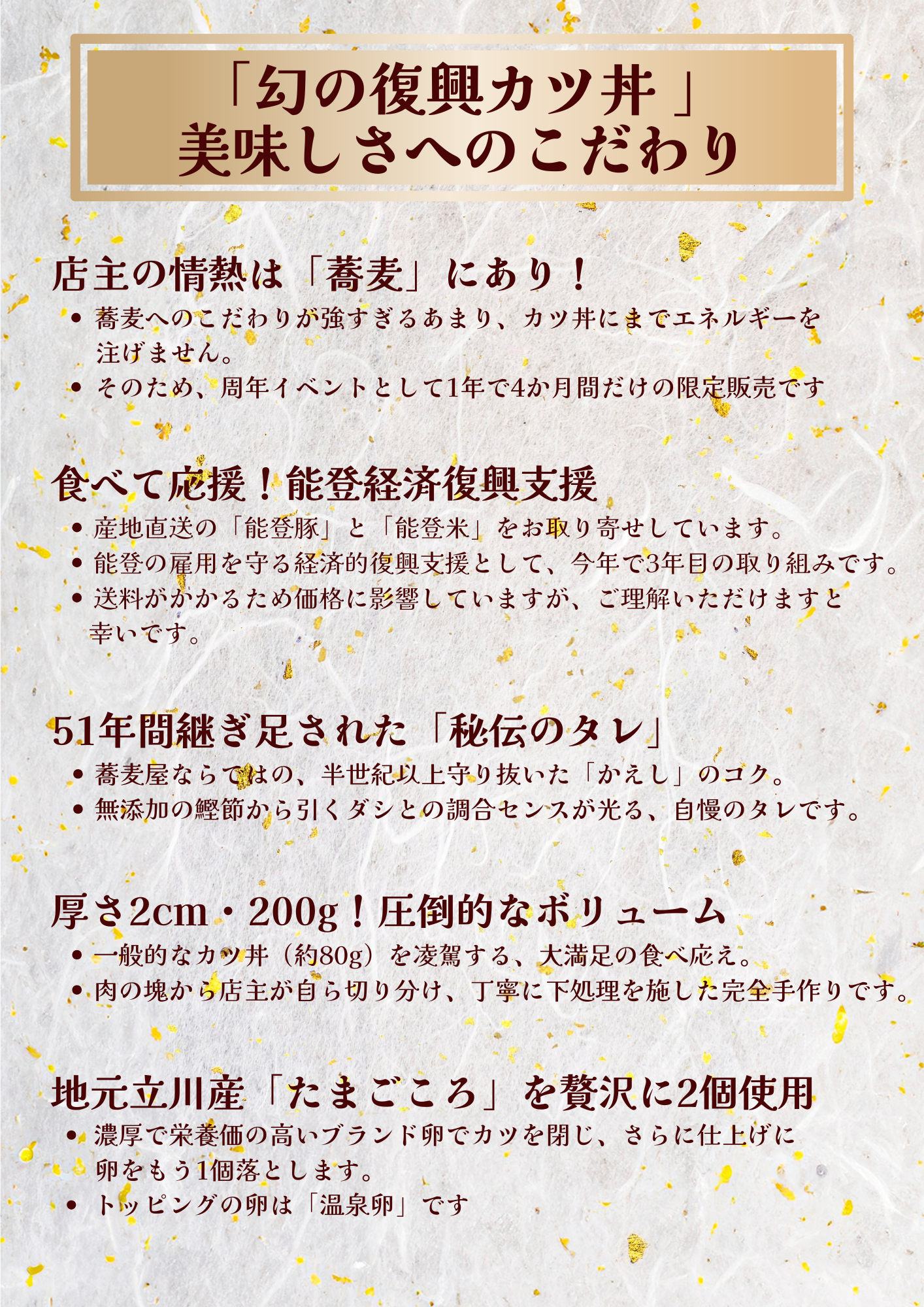 【ただ今お休み】 大和芋をすり鉢で丁寧におろし空気を含ませフワフワに。 「とろろ」が麵汁の上に浮かび、最後まで沈みません。 立川産卵「たまごころ」を使ったインスタ映えする一品 |